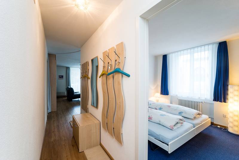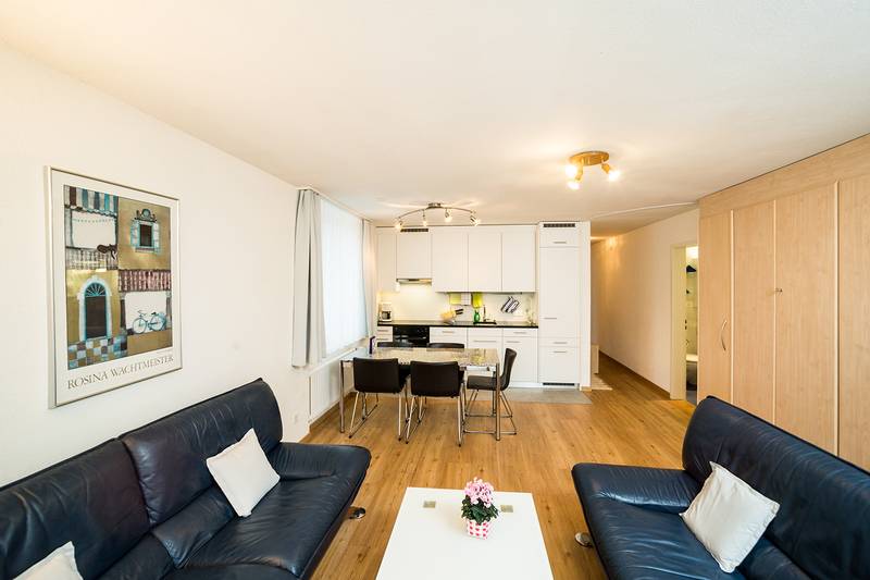 Zentrale, helle und sonnige 3-Zimmerwohnung (60 m2) im 1. Stock mit grossem, neuem, teilverglastem Südbalkon (möbliert), schöne Aussicht. Wohnschlafzimmer (Doppelschrankbett: zwei Betten nebeneinander) mit Parkett, ein Schlafzimmer mit Doppelbett und Parkett und grossem Schrank, ein Schlafzimmer mit zwei Einzelbetten (können zu einem Doppelbett zusammengeschoben werden) mit Parkett und Schrank (Zusatzbett möglich). Neue eingebaute Küche mit Geschirrspülmaschine, Backofen, Mikrowelle, Nespresso Kaffeemaschine und Wasserkocher. Bad mit grosser Dusche und WC.