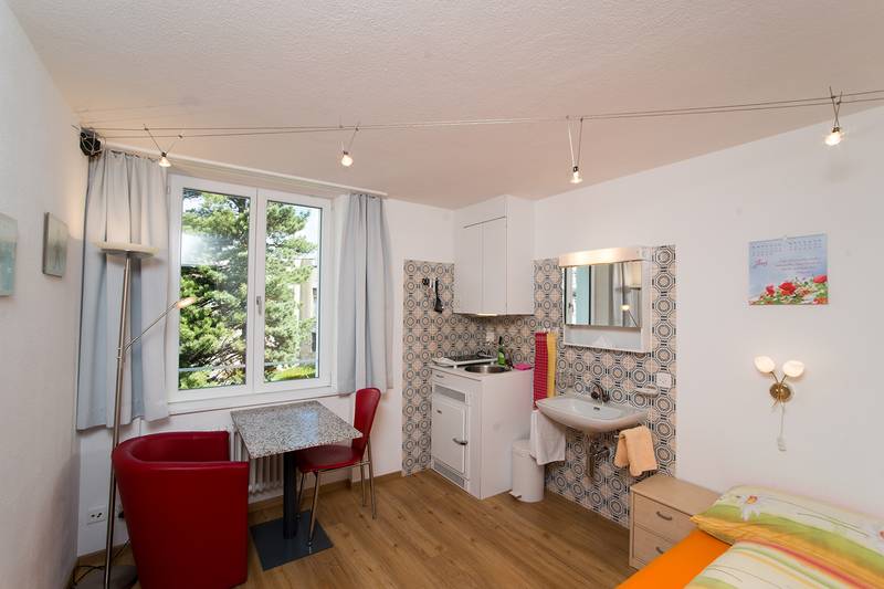 Freundliche, zentrale und ruhige Nichtraucherzimmer mit Kochnische (kleiner Kühlschrank, 2-Platten Rechaud, Geschirr für eine Personen, Kochtöpfe, Besteck etc. Nespresso Kaffeemaschine, Wasserkocher, etc.). Schöne Aussicht auf Berge. Grosse Dusche und WCs zur Benützung neben dem Zimmer.